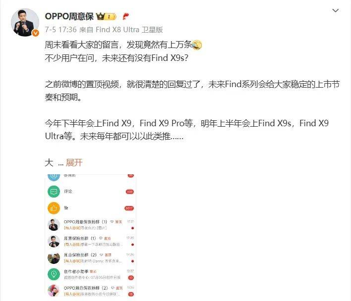 上个月,OPPO Find 系列产品负责人周意保明确发文,今年下半年将推出 Find X9、Find X9 Pro 等新机,明年上半年则会有 Find X9s、Find X9 Ultra 等机型问世,且未来每年都将延续这一产品节奏。这一消息瞬间引发了广大数码爱好者的关注,大家纷纷对 OPPO Find X9 系列充满期待。